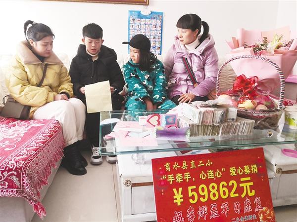 精神的痛苦,昂贵的医药费让这个原本不太富裕的家庭雪上加霜!自孩子患病以来,孩子的爸爸在外打工支付昂贵的医药费,妈妈在家照顾生病的女儿。商水县直第二小学校长周文学了解情况后,立即召开领导班子会议,经研究决定,学校号召全体师生对四(4)班李烨晨同学进行爱心募捐活动。
