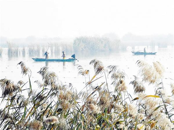 12月14日,两艘冬捕的渔船在淮阳区龙湖布网捕鱼。湖岸芦苇摇曳,远处薄雾蒙蒙,景色迷人,恰似水墨丹青。 记者 杜欣 摄