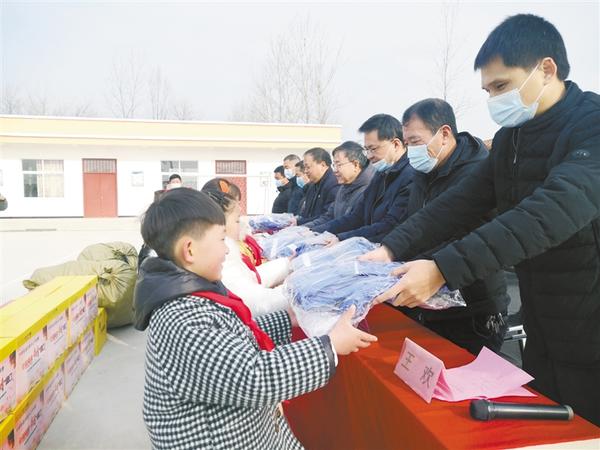 12月18日上午,全国青联委员、周口市青年志愿者协会会长王欢积极对接社会资源,携手中移铁通河南分公司,走进西华县叶埠口乡枣岗小学开展“温暖冬天”慰问活动,为该校捐赠1050册图书,并为全校96名小学生每人捐赠了一件棉衣。记者 张猛 摄