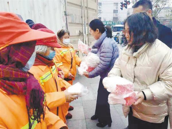 本报讯 12月26日上午,周口市妇联、周口报业传媒集团联合佳利地产和德庄火锅两家爱心商家为环卫工人送上娃娃菜和手套等慰问品。