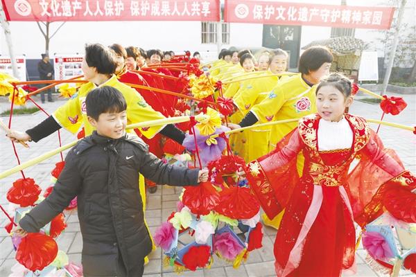 12月27日,小学生在河南省平顶山市宝丰县张八桥镇姚店铺村跟民间艺人一起表演非遗经担舞。 当日,河南省宝丰县举办首届“匠人匠心 非遗大集”活动,来自当地的非遗传承人和民间艺人们欢聚乡村,展示特色非遗项目,吸引了众多市民和游客前来“赶集”,感受非遗的魅力。 新华社 发