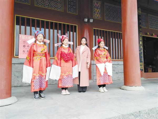 放榜仪式在三清殿殿前广场进行,装扮一新的状元、榜眼和探花自豪地站在榜前。头戴双翅冲天冠的状元为六年级学生聂思羽,她接过鼓槌,击鼓鸣志……台下学子心潮澎湃,新奇而激动。