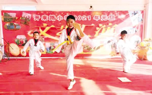 元旦前夕,周口经济开发区开来路小学为丰富师生校园文化生活、展现素质教育成果,全校师生自编自演了一场喜迎2021年元旦文艺会演,架子鼓、相声、口才秀、陶笛……节目精彩纷呈,受邀观看表演的家长无不拍手叫好。图为该校学生在表演跆拳道。