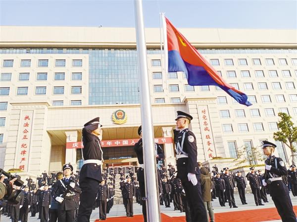 1月10日,为庆祝的到来,周口市公安局举行第一次升警旗仪式。警旗的旗面由红蓝两色组成,红色为主色调,警徽居旗帜左上角。红色体现党对人民警察队伍的绝对领导、全面领导,彰显人民警察队伍绝对忠诚、绝对纯洁、绝对可靠的政治本色;蓝色凸显人民警察的职业特征,代表人民警察对平安的守护。记者 张洪涛 摄