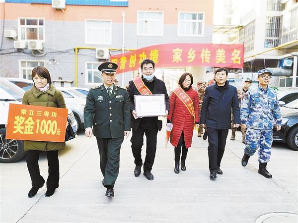 本报讯 “真是没想到,现在部队还专门将喜报送到家里,这是我们全家的荣耀,感谢部队为我们培养了这么优秀的儿子!”1月12日下午,川汇区人武部部长陈继芳和区退役军人事务局的领导一同来到和谐花园小区将立功喜报送到现役军人董波的家里。看到儿子荣立三等功的大红喜报,董波父母脸上乐开了花。据悉,当天下午共送出4份三等功喜报。