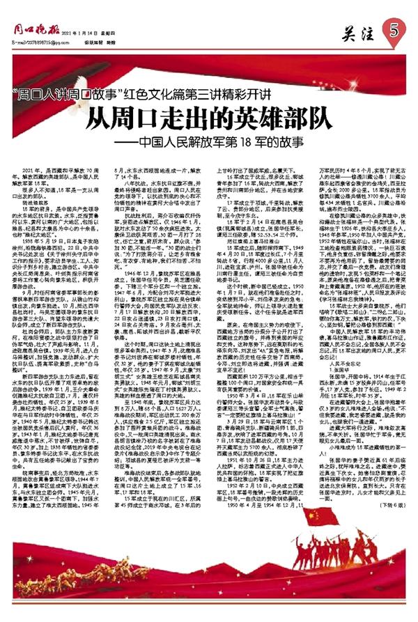 2021-01-14 ——中国人民解放军第18军的故事 “周口人讲周口故事”红色文化篇第三讲精彩开讲 2 2 周口晚报 content_124716.html 1 从周口走出的英雄部队 /enpproperty-->