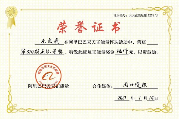 2021年1月14日,乐文亮的事迹在阿里巴巴天天正能量评选活动中,荣获第370期正能量奖,由阿里巴巴天天正能量联合周口晚报,向乐文亮颁发荣誉证书及正能量奖金5000元,以资鼓励。