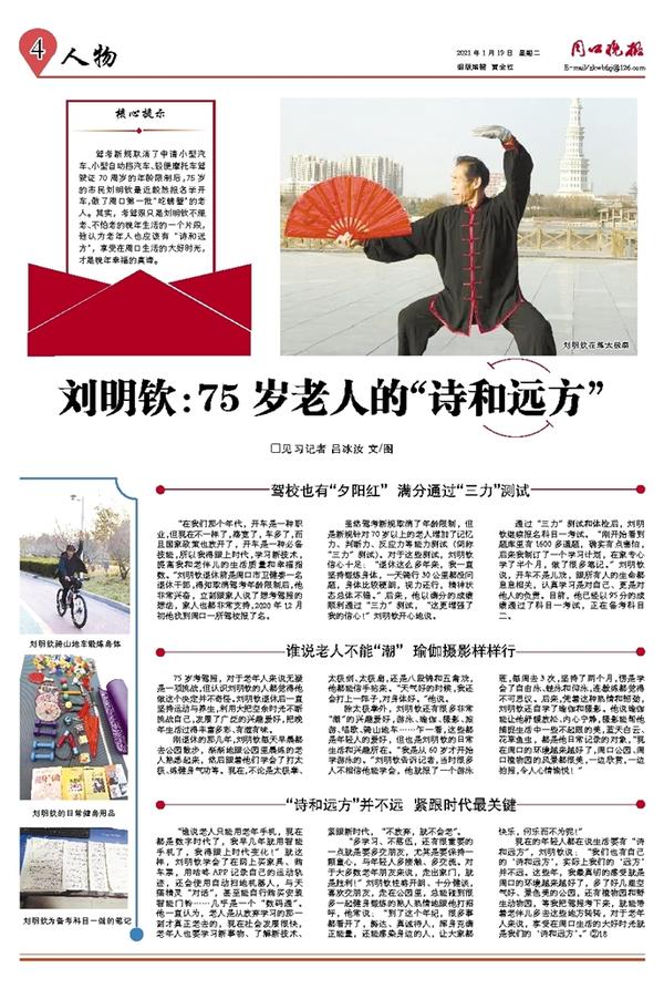 现在的年轻人都在说生活要有“诗和远方”,刘明钦说:“我们也有自己的‘诗和远方’,实际上我们的‘远方’并不远。这些年,我最真切的感受就是周口的环境越来越好了,多了好几座空气好、景色美的公园,还有植物园和野生动物园,等我把驾照考下来,就能带着老伴儿多去这些地方转转,对于老年人来说,享受在周口生活的大好时光就是我们的‘诗和远方’。”②18