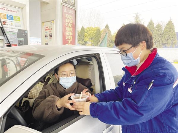 昨日(农历腊月初八),中石化周口分公司一名员工给加油司机递上腊八粥。当日,该公司组织员工开展腊八节献爱心活动,为每一位前来加油的司机送上热气腾腾的爱心粥。通讯员 王海霞 摄