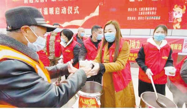 1月20日,在太康县人民广场,志愿者为环卫工人送上热气腾腾的腊八粥。当日,太康县党外知识分子联谊会、太康县城市管理局、“爱心粥屋”志愿者协会在太康县人民广场举办“情浓腊八粥,温暖太康人”公益活动,为环卫工人、城管队员、交警送去关爱。记者 张洪涛 摄