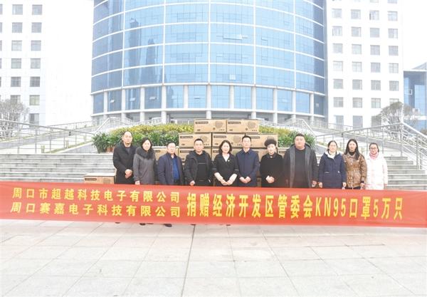 本报讯 近日,周口超越科技电子有限公司、周口赛嘉电子有限公司向开发区捐赠KN95医用口罩5万只(如图),助力开发区扎实做好疫情防控常态化工作。开发区管委会副主任谷静对企业的爱心捐赠表示感谢。