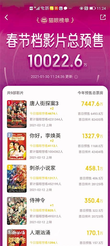 哪部影片将最终拔得春节档头筹尚未可知,但在猫眼和淘票票的想看人数排行榜及首日预售票房排行榜,曾取得去年春节档票房预售冠军的《唐人街探案3》均遥遥领先,已提前预订春节档“霸主”地位。预售首日下午,《唐人街探案3》便已创下国产电影预售最快破5000万元的新纪录。据猫眼专业版数据,截至1月30日11时24分,春节档所有影片总预售破亿。