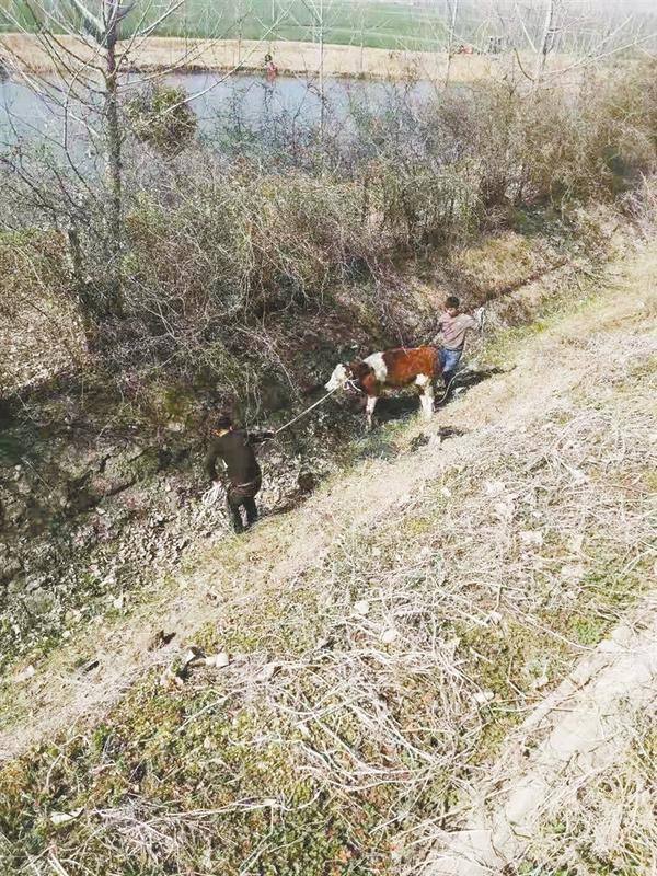 接警后,距离事发地点最近的周口高速二大队项城中队值班民警迅速赶往现场。民警到达现场后了解到,一辆货车从北方到南方运输肉牛,有两头牛在行驶途中突然受惊撞破车上围栏跳到了高速公路上。其中一头牛越过高速公路中央隔离护栏跑到了对向车道,一辆轿车躲避不及与其发生碰撞,导致车辆严重损坏,牛被撞死。另一头牛在高速公路上来回跑,过路车辆纷纷躲避,十分危险。民警立即指挥行驶车辆暂停,招呼司机等人把牛赶到高速公路附近的边沟,让车主和司机在边沟内捉牛(如图)。经过一番围追堵截,这头牛被捉住关回车厢。