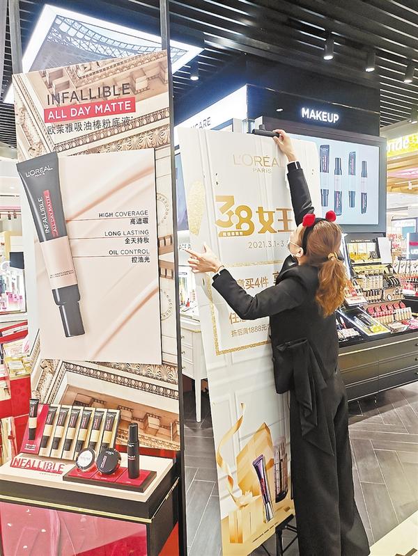 一化妆品专柜负责人介绍,根据往年的经验,“三八”妇女节前,每天的销售额要比平时攀升一倍,有女性自己购买的,有小伙儿买给女友的,有子女送给母亲的……