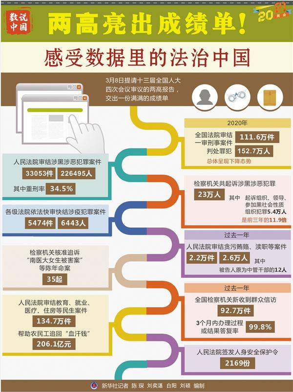 8日提请十三届全国人大四次会议审议的两高报告,交出一份满满的成绩单。扫黑除恶“打伞破网”、严惩腐败守护平安、加强民生司法保障……一串串数字勾勒出法治中国建设的亮点。