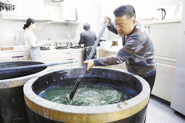 3月9日,兰州交通大学染缬艺术研究所所长管兰生(右一)搅动染缸。 染缬是一种传统印染工艺,甘肃省兰州交通大学染缬艺术研究所继承古籍中染缬技艺的染料选择和染制方法,同时拓展新原料并设计具有现代感的图案,制作出展示丝路文化、表现浓郁地域特色的各式染缬作品。 新华社记者 马希平 摄