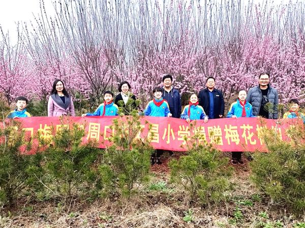 周口市文昌小学师生在捐赠的梅树前合影。 记者 高洪驰 摄 (详见三版)