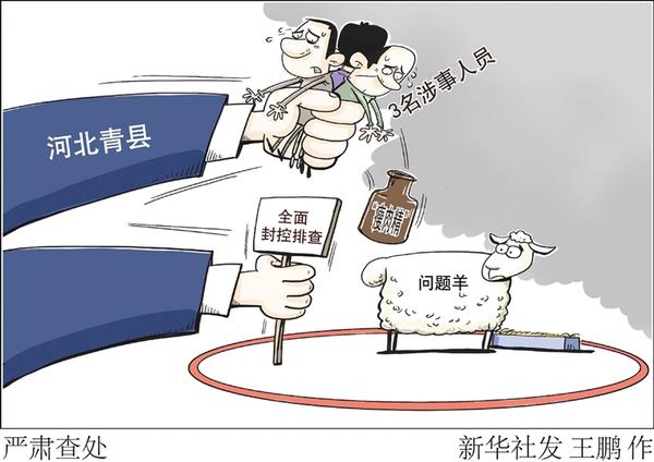 “瘦肉精”问题羊肉被曝光后,河北青县县委、县政府于当晚9点半开始,连夜开展封控排查处置工作。截至3月16日上午8点,在涉事养殖户回成杰养殖场饲料中检测出“瘦肉精”阳性,对新兴镇21.9万只存栏羊的抽样送检以及全县所有肉羊养殖户的排查工作正在进行中。新华社发 王鹏 作