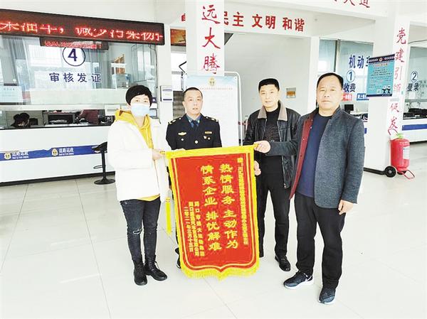 3月15日上午,周口市远大运输集团、河南平安运输集团等企业代表向川汇区运管局货运管理办公室、证照室送来了写着“热情服务、主动作为,情系企业、排忧解难”“心系业户、高效便民”的锦旗,感谢川汇区运管局货运管理办公室主动作为,积极协调,成功协助该集团公司查处应淘汰“国三”车辆,高效务实的解决了企业难题,并对川汇区运管局证照室积极服务企业,采取“五分钟办证”措施表示赞扬。记者 陈永团 摄