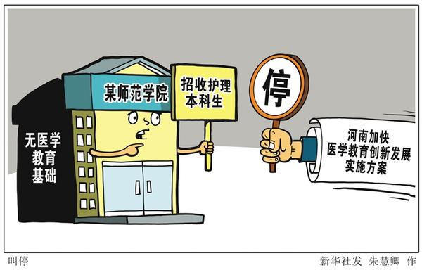 某烹饪职业学院在积极申办护理专业,一个只有4个专业课教师的师范学院开始招收护理本科生……这种现象今后将被叫停。日前,河南省人民政府办公厅出台河南加快医学教育创新发展实施方案,规定无相关医学类专业基础的非医学院校不得设置医药卫生类专业,为随意设置护理、临床等人命关天的医药卫生类专业划上“休止符”。新华社发 朱慧卿 作