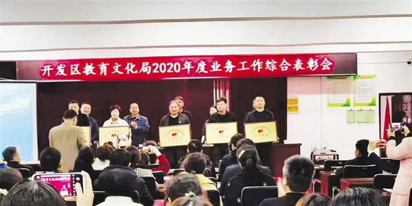 3月31日,周口经济开发区教育文化局2020年度业务工作综合表彰会在经开区第一小学召开。副局长康颖珠、业务科科长张振海、局机关党支部书记贺保罗及全区100多名获奖教师出席会议。经开区一小再次荣获“书香校园”,三年级4班被评为“书香班级”,田红霞再次荣获“十佳作者”,郑秋娟、孙玉霞、田红霞荣获“教师阅读之星”,祁倩倩、李晓丹、毛畅畅、李媛媛、魏二霞、彭红杏等19位老师喜获教师书法比赛大奖。记者 赵莹莹 通讯员 田红霞 摄