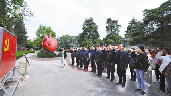 周口报人在鄂豫皖苏区首府烈士陵园重温入党誓词。记者 房杰 摄