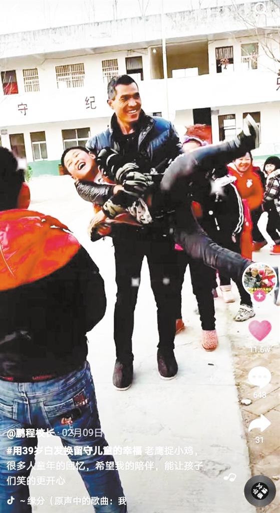 张鹏程“走红”,是在今年2月9日。张鹏程在抖音发布“用39岁白发换留守儿童幸福”的视频登上热榜。视频中,张鹏程和孩子们玩老鹰捉小鸡的游戏(如左图),引来11.6万网友点赞。