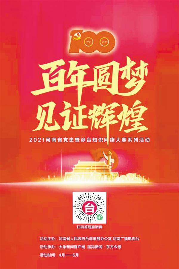 本报讯 记者从市委统战部获悉,4月12日至5月12日,由河南省台办、河南广播电视台主办的“百年圆梦 见证辉煌”2021河南省党史暨涉台知识网络大赛正式拉开帷幕。