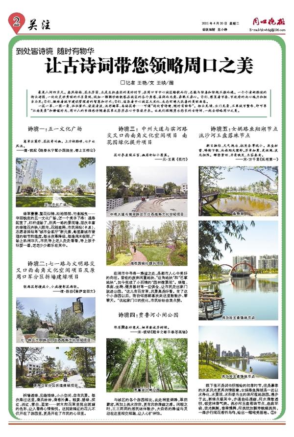 一花一草、一园一景,泓泓碧水、漾漾清波,流彩掩翠、鸟语花香……可谓“到处皆诗境,随时有物华”。抬头见绿、出门见景,不离城市繁华,即可享“江南美景”和静谧时光,周口人的幸福感伴随着花草之芬芳在心中荡漾开来。让我们跟随隽永悠长的古诗词,一起去领略周口之美。