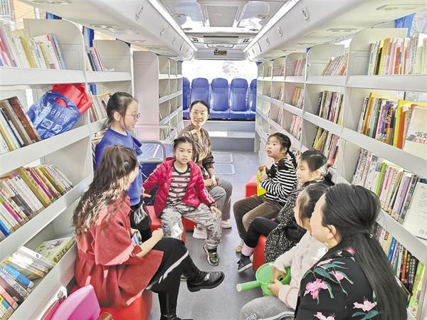 市民带领孩子在“汽车图书馆”阅读后交流心得。4月17日~4月18日,川汇区邮政小区和七一路居委会文明社区迎来了周口市图书馆的“汽车图书馆”大巴车,车上满载3000多册各类图书,免费向社区居民开放阅览,让居民阅读“零距离”。