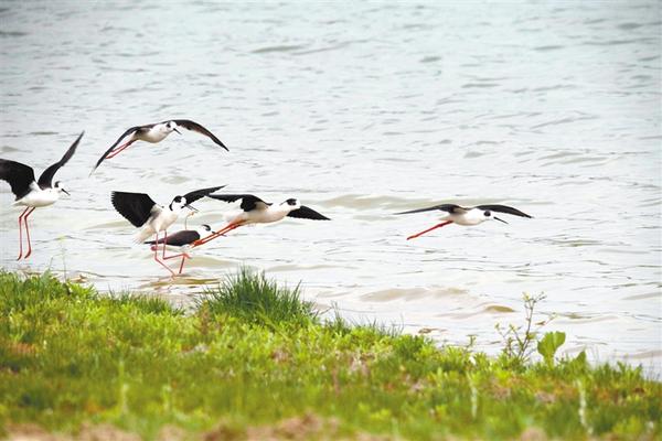4月23日上午,成群的黑翅长腿鹬现身中心城区沙颍河,它们在湖边觅食嬉戏,成为春日一景。黑翅长腿鹬属于国家保护动物,有“长腿美娘子”之称,经常栖息于开阔的平原草地中的湖泊、浅水塘和沼泽地带。近年来,我市通过开展水系治理,河湖生态优美、鱼虾成群,吸引着各种鸟类安家周口。记者 梁照曾 摄
