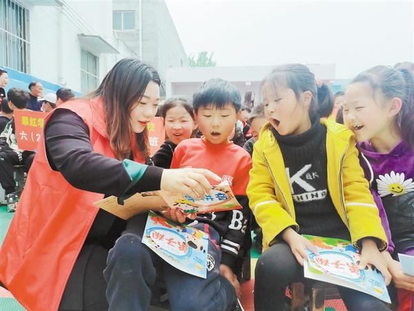 4月23日,志愿者带领孩子们阅读。当日是世界读书日,周口市三川社工义工服务中心、周口立明眼镜视光中心组织志愿者,带着1000本图书来到市城乡一体化示范区搬口办事处翠红小学,开展99公益关爱留守儿童捐建爱心图书室活动,让孩子们享受读书的快乐。②18记者 窦娜 摄