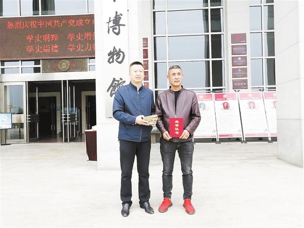 本报讯 4月25日,周口市博物馆收到我市市民赵团结捐赠的两件唐代黄釉瓷碗,该文物对周口漕运史具有研究价值。市博物馆馆长周建山向赵团结颁发收藏证书(如图),并感谢他对周口考古工作的支持。