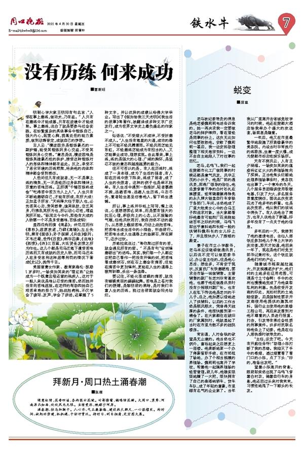 明朝心学大家王明阳有句名言:“人须在事上磨练,做功夫,乃有益。” 人只有在磨练中才能成器,只有在逆境中才能成熟。事上磨练,说白了就是要参与社会实践,在纷繁复杂的具体事务中锻炼自己,强大内心,拓宽心胸,提高处世的能力素质,做到动静皆定,成就自己的梦想。