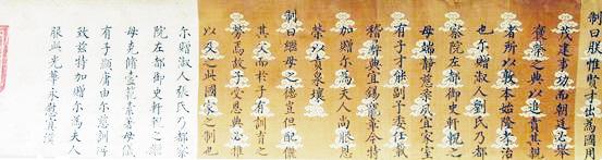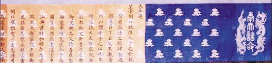 为表彰他的父亲、母亲以及继母刘氏教子有方,为国家培养了一位栋梁之才,明天顺五年,也就是1461年,英宗皇帝颁发诰命,追赠其父轩贵为资政大夫、都察院左都御史,母亲刘氏、继母张氏为夫人。这道诰命长3.5米,宽0.3米,是由“江宁织造”用提花锦缎织成的五彩锦缎制品。底色由蓝、浅黄、深黄、白、绿五种颜色构成,祥云图案作底纹,右端织有“奉天诰命”四字篆书,字两边织有银色双龙图案作为防伪标识。圣旨内文为墨书小楷,文后盖有“制诏之宝”朱色玺印,印记落款“天顺五年十二月七日”。“制诏之宝”左上侧为皇家骑缝章,也是防伪标识。圣旨虽年代久远,但字迹仍十分清晰,落款处的印章彰显出昔日皇权无上的威仪。