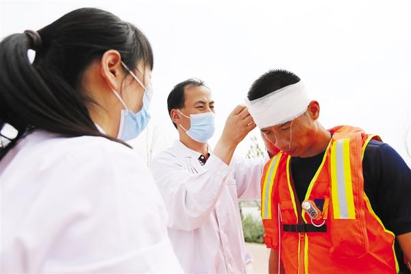 5月12日,安徽省淮北市相山区举行防灾减灾应急演练。这是医护人员对“受伤人员”进行包扎。