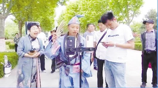 本报讯 随着网络直播行业兴起,越来越多的人有了自己的直播间。近日,记者在周口公园看到,有多位网红主播通过手机进行户外视频直播。