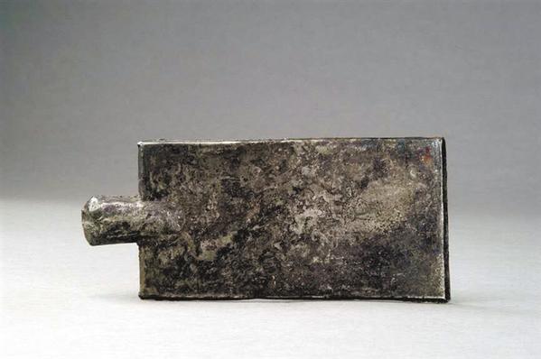 在周口市博物馆展厅中,陈列着一件楚国实首方肩银布币,它呈长方形铲状,长13.6厘米,宽6.2厘米,短柄,实首,灰白色,保存完好,为国家一级文物。
