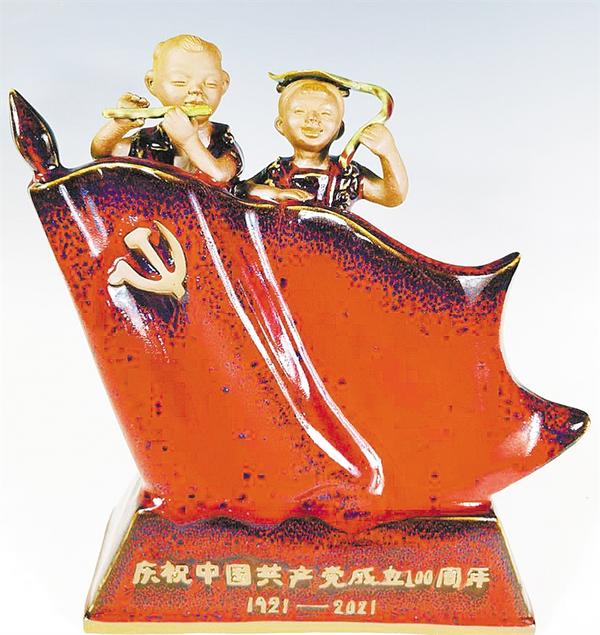 “唱支山歌给党听,我把党来比母亲…… ”画面中随风飘荡的红色党旗鲜艳夺目,窑变神奇、自然,党旗下方刻有“庆祝中国共产党成立100周年”(1921~2021),党旗的上方有两个儿童,其中男孩吹着笛子、女孩陶醉在美妙的歌声中,寓意中国共产党领导下的新中国未来更加繁荣昌盛。