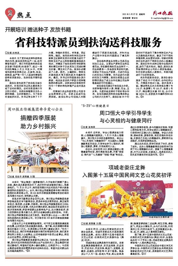 本报讯 为了更好地发挥科技特派员的作用,服务扶贫和生产一线,在河南省科技厅、周口市科技局和扶沟县发改委(科技局)的指导下,经过一周时间的筹备,5月21日至24日,河南省科技特派员韩卫红、王彦伟、张蕊、郝艳丽、赵严等一行5人组成河南省科技特派员服务队,赴扶沟县开展科技服务。