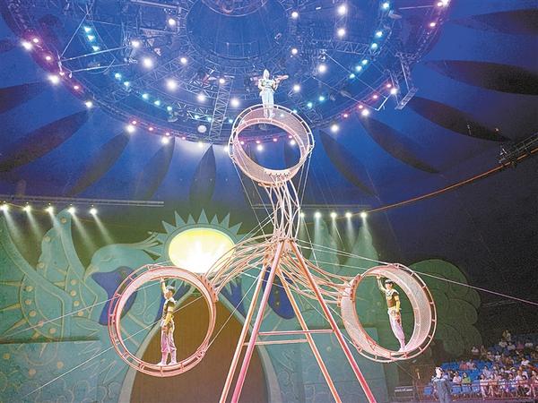 之后的节目是3个钢圈组成一个圆,3名杂技演员依靠配合,让圆转动起来。接着,演员在转动的钢圈中或走、或舞、或跳绳,甚至有1名演员在圆外面蒙眼跳舞。现场惊叫声、欢呼声不断。