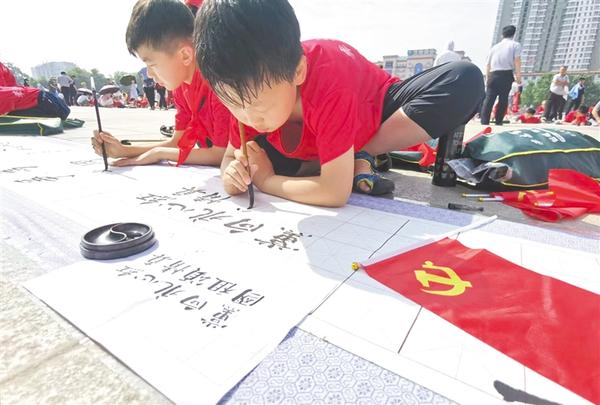 5月29日上午,孩子们在认真书写毛笔字。当日,由团市委、市少工委、市青联、市青年书法家协会主办,周口李为书法学校承办的“红领巾向党 争做新时代好少年”周口市庆“六一”书法作品现场创作活动在中心城区五一文化广场举行。活动中,少年儿童用手中的笔书写了对党、对祖国母亲的爱,向党的百年华诞献礼。②7记者 张洪涛 摄