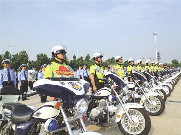6月2日,公安民警誓师安保维稳。当日,我市建党100周年安保维稳誓师大会在中心城区和谐广场举行。活动在庄严的国歌声中拉开帷幕,护旗手迈着铿锵有力的步伐护卫崭新的国旗、警旗入场,全体民辅警向国旗、警旗敬礼。活动启动后,警用摩托车、警车组成的巡逻车队浩浩荡荡驶向辖区重要路段进行巡逻。今年以来,全市公安机关在市委、市政府和省公安厅的坚强领导下,把建党100周年安保维稳工作作为贯穿全年公安工作的重点,坚决守牢周口安全稳定的“底线”。记者 陈永团 摄