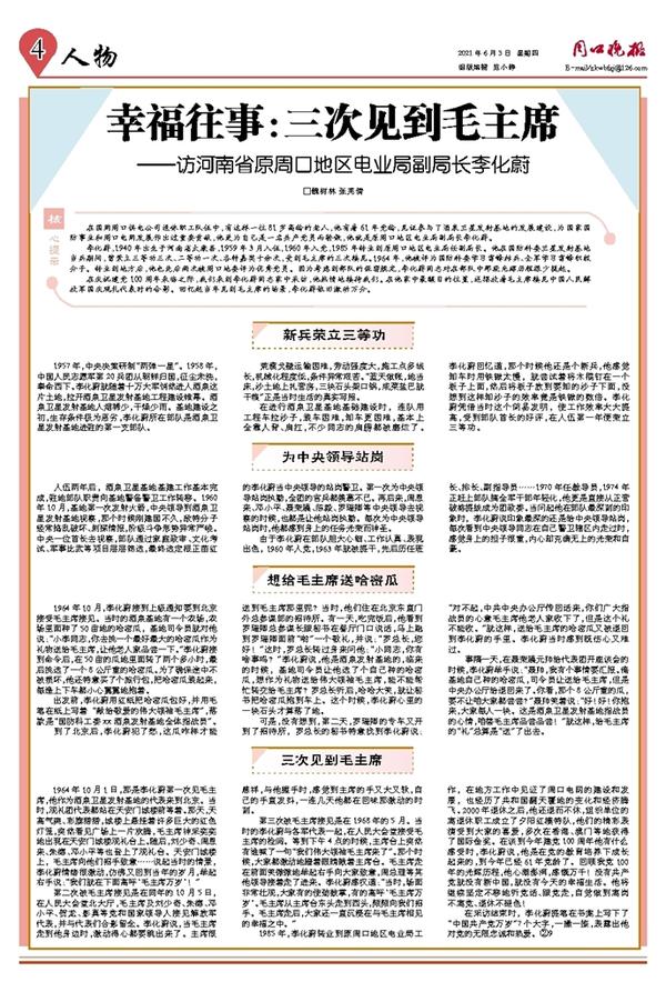 到了北京后,李化蔚犯了愁,这瓜咋样才能送到毛主席那里呢?当时,他们住在北京东直门外总参谋部的招待所。有一天,吃完饭后,他看到罗瑞卿总参谋长跟秘书在餐厅门口说话,马上跑到罗瑞卿面前“啪”一个敬礼,并说:“罗总长,您好!”这时,罗总长转过身来问他:“小同志,你有啥事吗?”李化蔚说,他是酒泉发射基地的,临来的时候,基地司令员让他选了个自己种的哈密瓜,想作为礼物送给伟大领袖毛主席,能不能帮忙转交给毛主席?罗总长听后,哈哈大笑,就让秘书把哈密瓜抱到车上。这个时候,李化蔚心里的一块石头才算落了地。