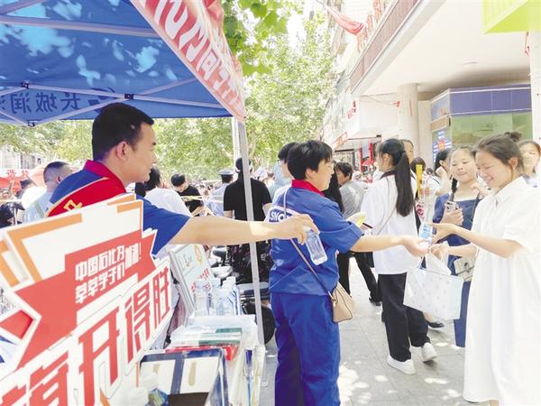 志愿者为考生免费赠送饮用水。通讯员 王海霞 摄