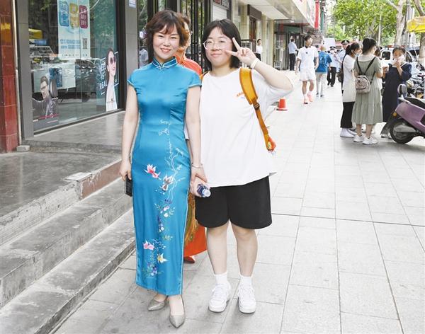陪考妈妈着旗袍为孩子加油。记者 孙安平 摄