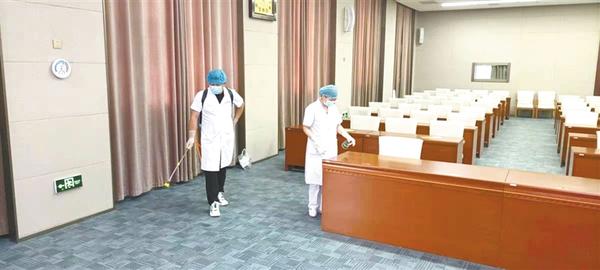 为全力确保市两会期间与会人员的健康安全,市卫健部门高度重视,科学制订方案,精心部署安排,成立7个工作组,明确责任分工,进驻各点做好保障工作。图为两会防控保障和卫生监督工作人员为政府会议室进行消毒。