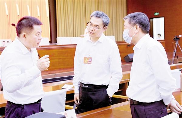 6月10日,市四届人大六次会议开幕式结束后,人大代表交流讨论政府工作报告。记者 孙安平 王映 摄