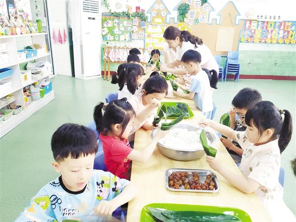 6月11日上午,市直幼儿园大班小朋友在老师的指导下包粽子。端午节将至,为了增进孩子们对端午习俗的了解,让他们在寓教于乐中体验中华民族的传统文化,感受到端午节有趣生动的文化内涵,增强幼儿的民族自豪感, 市直幼儿园开展了“听故事、讲民俗、包粽子、品粽香、做香囊”等丰富多彩的端午节主题活动。记者 孙安平 摄