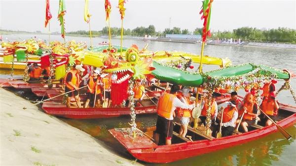 本报讯 6月10日,在周口市第七届中华龙舟大赛现场,川汇区市级非遗项目周口翎船会传承人组织开展了翎船会表演,赢得了广大观众的阵阵喝彩。